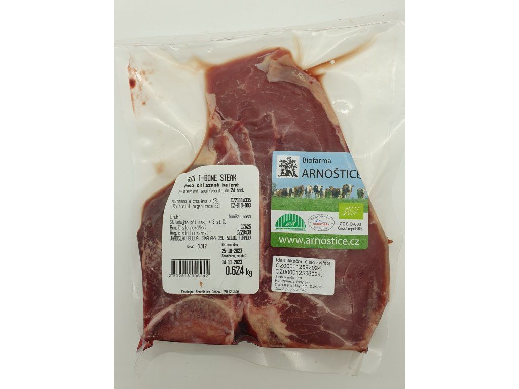 T-bone steak získal svůj název podle tvaru bederního obratle, který připomíná písmeno T. Podél kosti je patrná část svíčkové a roštěné, na povrchu se nachází jemné tukové krytí. Hodí se na grilování a smažení. V balení je jeden steak s kostí o výšce 3-4cm (0,5-0,7kg). Objednáváte 1ks.